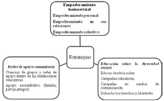 En Homofobia, se reporta Homofobia internalizada. Finalmente, en Estrategias para fortalecer la orientación sexual homosexual, se resalta la Educación sobre la diversidad sexual, Redes de apoyo comunitario y Empoderamiento homosexual.