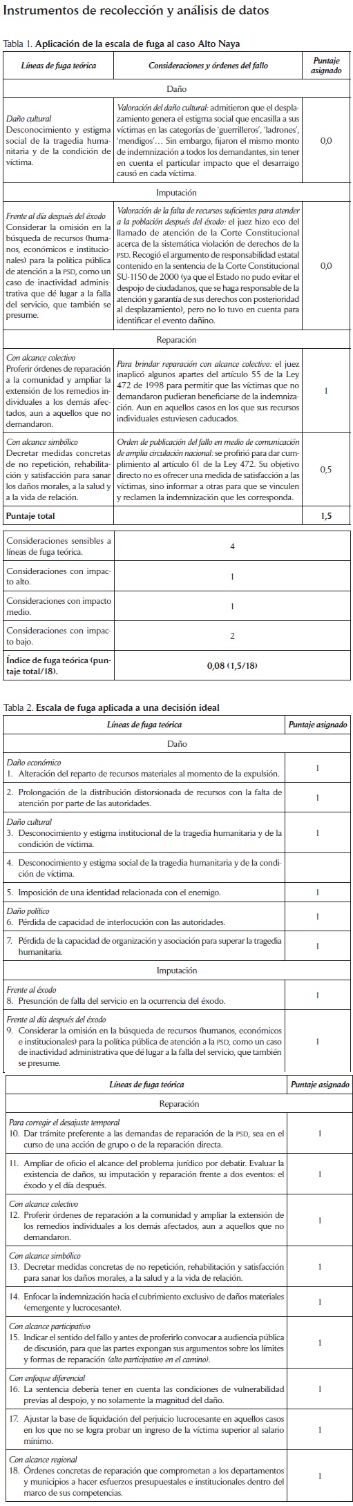 El camino hacia la tercera respuesta comenzó en un ejercicio de contraste entre las líneas de fuga teórica y el contenido de los fallos seleccionados. Decidimos plasmarlo en términos numéricos para hacer más evidente la relación. Por esto, diseñamos dos instrumentos de análisis: la escala de fuga teórica y el índice de fuga teórica. A través de la primera, evidenciamos el impacto que tuvo cada propuesta académica sobre los argumentos y órdenes del juez. Por medio del segundo, establecimos qué tan cerca o lejos estuvo cada fallo de lograr una solución ideal a las víctimas que reclamaron reparación. Los detalles de cada herramienta se darán en el acápite de resultados.