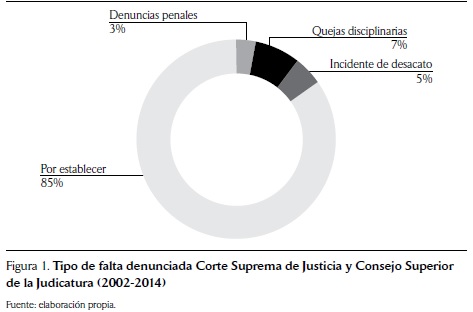 34 La ausencia de estudios académicos y estadísticas oficiales sobre el tema contrasta con la gran cantidad de páginas dedicadas por diferentes medios de comunicación a este tipo de denuncias. Véase: Proceso contra campo soto, (4 de julio de 2000), El Tiempo. Despilfarro en la judicatura, (28 de septiembre de 2000). El Tiempo. Comisión de acusación tiene el caso. Magistrada denunciada por sus colegas, (23 de mayo de 2003), El Tiempo. El juez y la mafia, (25 de noviembre de 2006). El Tiempo. Amistades peligrosas, (02 de diciembre de 2006). Semana. Denuncia penal de Uribe contra presidente de la Corte Suprema de Justicia, (18 de enero de 2008), El Tiempo. Uribe demandara por injuria y calumnia al presidente de la Corte, (18 de enero de 2008), El Espectador. Gobierno contra ataca a Corte Suprema con denuncia a sus magistrados, (27 de junio de 2008), El Tiempo. Sorpréndase: mi vida social ha sido siempre muy restringida (12 de julio de 2008), El Espectador. Magistrados preocupa su elección, (30 de agosto de 2008), El Espectador. Ovidio claros, nuevo magistrado del Consejo Superior de la Judicatura está demandado por alimentos (8 de septiembre de 2008), El Tiempo. Orozco, C., (10 de octubre de 2008). Denuncié a cuatro magistrados del Consejo Superior de la Judicatura, El Espectador. Coronell, D. (11 de abril de 2009). Un magistrado en Problemas, Semana. La red del Consejo de Estado, (05 de septiembre de 2009), El Espectador. Las llamadas de los magistrados que la procuraduría pide investigar, (06 de septiembre de 2009), El Espectador. Acusaciones enfrentan a la sala administrativa con la disciplinaria de la Judicatura, (11 de Enero de 2012), El Espectador. Denuncian sobrecostos en contratación en Sala Administrativa de la Judicatura, (11 de enero de 2012), El Espectador. Choque de trenes por investigación de carrusel de nombramientos, (16 de febrero de 2012), El Tiempo. Abren proceso de responsabilidad iscal contra nueve magistrados, (7 de marzo de 2012), El Espectador. Senadores y magistrados admiten tener familiares en la procuraduría, (10 de octubre de 2012), El Espectador. Necesitamos mejores magistrados: Presidenta de la Judicatura, (28 de octubre de 2012), El Tiempo. ¿Quién frena a los magistrados?, (17 de noviembre de 2012), El Tiempo. Orozco, C. (04 de mayo de 2013). Entrevista a Néstor Raúl Correa, El Espectador. Este sábado llegan a Cartagena los magistrados de polémico crucero, (24 de mayo de 2013), El Tiempo. Fin del carrusel de pensiones, (25 de mayo de 2013), El Espectador. Piden embargar sueldo de la magistrada María Mercedes López, (19 de junio de 2013), El Tiempo. Fiscalía reveló pruebas en carrusel por pensiones, (09 de agosto de 2013), El Espectador. Archivan investigación a secretaria de la Judicatura por carrusel de pensiones, (27 de agosto de 2013). El Espectador. Las pistas que destaparon el cartel de los magistrados de Paloquemao, (19 de octubre de 2013), El Tiempo. Las grabaciones que incomodan al magistrado Villarraga, (27 de octubre de 2013), El Espectador. El otro escándalo del magistrado Villarraga, (28 de octubre de 2013), Semana.