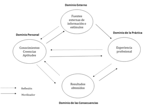 Si los propósitos de un sistema de reconocimiento profesional son promover cambios en el profesorado para una mejor práctica de enseñanza, entonces se debe promover el aprendizaje del profesor. En ese marco, la propuesta de Clarke y Hollingsworth (2002) tiene mucho sentido, dado que sostiene que el cambio de la práctica pedagógica no es una cuestión lineal como lo planteara Guskey (1986), un cambio en la práctica se traduce en un cambio en los resultados de aprendizaje y, por lo tanto, cambios en las creencias, conocimientos y aptitudes del profesor. Por el contrario, es un asunto que implica la intercomunicación entre cuatro dominios por donde el profesor transita y que constituyen andamios de desarrollo para un aprendizaje activo y significativo para él. Estos dominios son: 1) el dominio personal, el cual alberga los conocimientos, creencias y actitudes del profesor, en tanto, 2) el dominio externo contiene las fuentes de información externa o estímulos para el profesor, 3) el dominio de la práctica involucra la experiencia profesional y, 4) el dominio de las consecuencias sería aquél relacionado con los resultados de la práctica de enseñanza (figura 1).