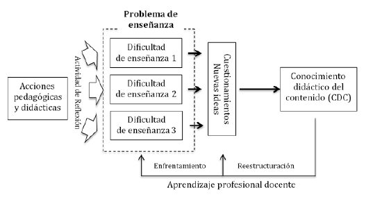 Programas de desarrollo profesional centrados en el CDC han demostrado un aumento del conocimiento sobre las dificultades del aprendizaje en profesores de física en formación (Karal y Alev, 2016). En tanto, Zhang et al. (2015) han usado el conocimiento didáctico como marco de referencia para examinar las necesidades de desarrollo profesional en profesores de ciencias. Compartiendo la idea de que el conocimiento didáctico es de naturaleza compleja (Nilsson, 2008), no podemos limitar su desarrollo a ejemplos de enseñanza de expertos (Van Driel y Berry, 2012), sino más bien a la identificación de dificultades de enseñanza que den sentido y valor a la actividad de reflexión docente para el aprendizaje profesional.