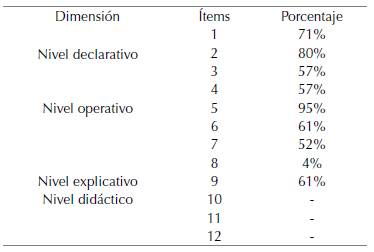 El porcentaje promedio de la muestra fue del 52%, lo que denota una valoración moderadamente satisfactoria. La figura 1 presenta los ítems en el orden antes mencionado, las primeras cuatro corresponden a la dimensión Nivel declarativo, las siguientes al Nivel operativo y así respectivamente.