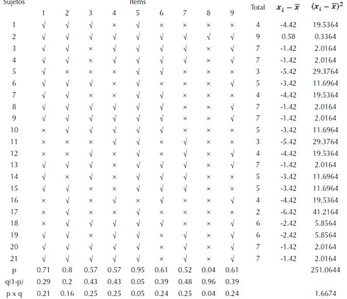 Así mismo, Stracuzzi y Pestana (2006) aseguran que la confiabilidad es la “ausencia de error aleatorio en un instrumento de recolección de datos”. Para calcular la confiabilidad del instrumento aplicado se utilizó el método K-R20, el cual procede de la siguiente forma: en primer lugar, para cada ítem se computa p, que es la proporción de sujetos que pasaron un ítem sobre el total de sujetos; luego, se computa q, que es igual a 1 - p; se multiplica p x q; y finalmente se suman todos los valores de p x q. El resultado obtenido es la sumatoria de la varianza individual de los ítems, o sea, Σp x q. En segundo lugar, se calcula la varianza total de la distribución de calificaciones (Vt); y, en tercer lugar, se aplica la fórmula correspondiente.