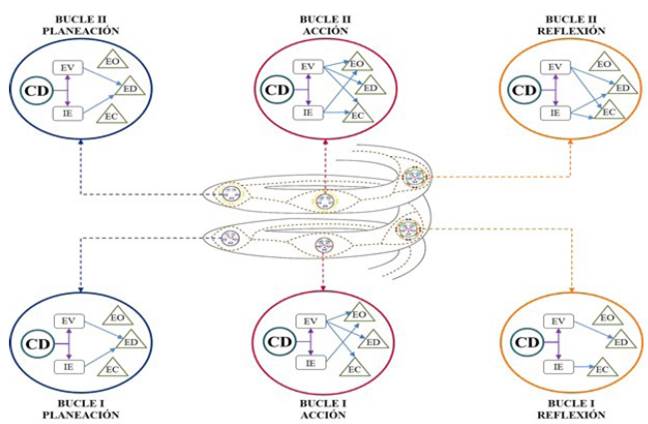 Esto posibilita la comprensión en profundidad acerca de la construcción del conocimiento profesional de profesor de Biología. Por otra parte, en coherencia con el desarrollo de los objetivos de la investigación (Caracterizar los conocimientos que se integran en la construcción del CPPB de un profesor en formación en relación con la enseñanza de la biodiversidad, en el espacio académico de la práctica pedagógica de la Universidad Distrital Francisco José de Caldas; Caracterizar el CPPB que se deriva como producto de la transformación de los conocimientos que se integran a través de la participación de un proceso de Investigación -Acción; Identificar los ejes Dinamizadores, Obstáculos y Cuestionamiento en el proceso de construcción del CPPB sobre la enseñanza de la biodiversidad en el estudio de caso.) y las consideraciones acerca de la necesidad de trascender una mirada interpretativa como lo plantea Abell (2008), se articula a la investigación los principios de la I-A de autores como Carr (1989), Kemmis y McTaggart (1988; 2013), Kemmis, McTaggart y Nixon (2014), a través del desarrollo de los bucles de la espiral auto reflexiva.