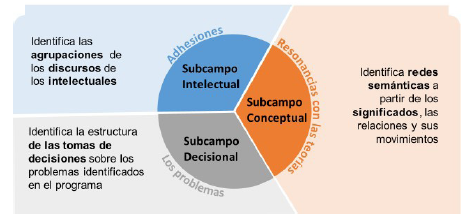 Este subcampo intelectual será estudiado en los documentos de los programas de formación de profesores de matemáticas, a partir de la identificación de las adhesiones que hacen los enunciados de los documentos del programa con las características de cada uno de los tipos que corresponden a cada tipología según su foco de organización para los campos de formación de profesores, currículo y didáctica de las matemáticas. Este subcampo permitirá conocer qué intelectuales, agrupaciones y características se identifica en cada programa de formación de profesores en los campos estudiados.