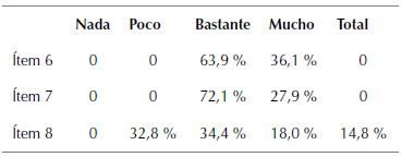 En este apartado se pregunta acerca del grado de acercamiento a los conceptos científicos como grupo tutor (ítem 6), al grado de acercamiento a los conceptos científicos como grupo participante (ítem 7), grado de aceptación de las ciencias antes de empezar el curso (ítem 8), y cómo ha mejorado el grado de aceptación a las ciencias al final de las prácticas (ítem 9). Véanse los porcentajes en la tabla 1 para los tres primeros ítems. Las repuestas presentan los siguientes grados: total, mucho, bastante, poco y nada; excepto el último ítem, cómo ha mejorado el grado de aceptación a las ciencias al final de las prácticas, que sigue los siguientes grados: ha mejorado, sigue igual y ha empeorado.