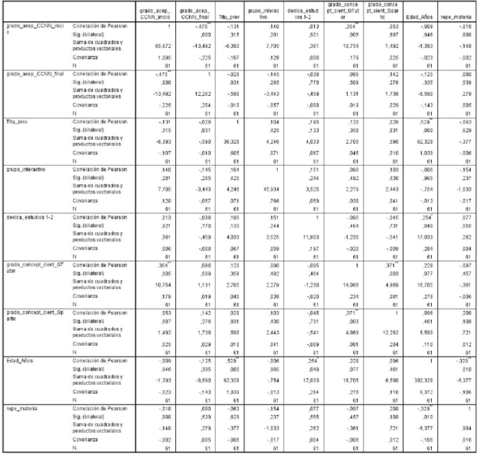 Las variables cuantitativas presentadas anteriormente se agrupan por pares para realizar la correlación de Pearson. En la tabla 2, presentamos la relación de pares en la cual podemos comprobar la existencia de seis pares en los que existe correlación significativa: (1) grado de aceptación de las ciencias al inicio y el grado de aceptación de las ciencias al final; (2) grado de aceptación de las ciencias al inicio y el grado de conceptos científicos como grupo tutor; (3) titulación previa y edad; (4) dedicación a los estudios y edad; (5) grado concepto científico grupo tutor y grado concepto científico grupo participante; y (6) años y repetición de la materia. Se puede observar que estos pares presentan un nivel de significación inferior a 0,01 excepto el par dedicación a los estudios y edad que la significación es inferior a 0,05. Para estas seis correlaciones cabe destacar que los pares (1) y (6) son correlaciones inversas en las que para el aumento de la primera disminuye la segunda mientras que para el resto de pares la correlación es directamente proporcional: al aumentar la primera lo hace igual la segunda. De esta manera, cuando el grado de aceptación de las ciencias al inicio del curso es alto, al final baja; y cuando mayores son las alumnas menos repiten la materia.