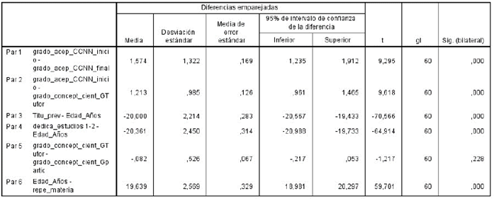 A esto seis pares correlacionados, les aplicamos la prueba T de muestras emparejadas. Únicamente, en el par grado concepto científico grupo tutor y grado concepto científico grupo participante se acepta la hipótesis nula tanto de distribuciones iguales de grupos para la prueba de Kendall como para la mediana de diferencias cero para la prueba de Wilcoxon. El resto de pares rechazamos la hipótesis nula y se acepta la alternativa de distribuciones no iguales, según la prueba de Kendall y la mediana de diferencias no es cero para la prueba de Wilcoxon, como se muestra en la tabla 3.