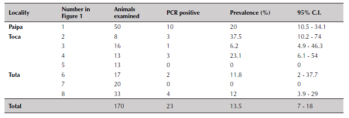 Results gave 13,5% overall parasite DNA prevalence (95% C.I. 7-18) in dairy cattle in six out of eight herds sampled from the municipalities of Paipa, Tuta, and Toca in Boyacá. Age was found to be an important factor that influences seroprevalence values, as seropositivity has been seen to increase with it (Dubey et al., 2007). N. caninum DNA was detected here in 23 cows over 30 months of age. This finding suggests that there is not enough evidence of recent displacement or passive transportation from other possible endemic zones.