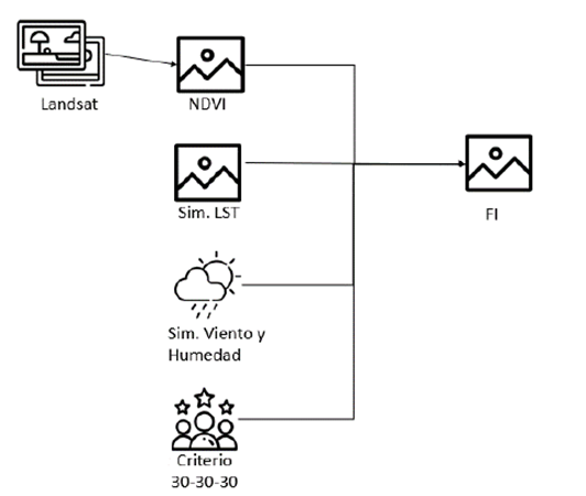 Con base en lo anterior se busca generar una nueva imagen resultante con todas las variables mencionadas, comprobando el cumplimiento del criterio 30-30-30 y un NDVI sobre 0.2 (lo cual es considerado un índice de vegetación alto) en cada pixel de la imagen resultante, sumando un 1 al valor del pixel, por cada criterio cumplido, pudiendo variar desde 0 (nula posibilidad de propagación de incendio) hasta 4 (propagación de incendio inminente).