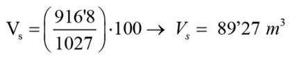 Si llamamos d am a la densidad del agua marina y aceptamos un valor medio de 1027 kg/m 3 , calculad el volumen sumergido para un bloque de hielo cuyo volumen total sea de 100 m 3 .