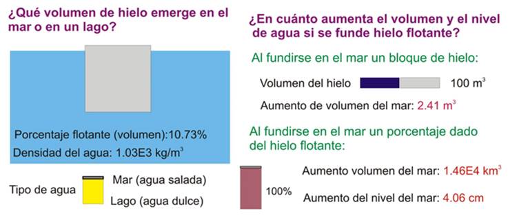 En una de ellas (figura 3), se representa en la pantalla un bloque de hielo flotando sobre una masa de agua. Los alumnos pueden usar un controlador manual para elegir entre agua marina y agua dulce, y otro para fijar el volumen total inicial del bloque de hielo flotante. La animación calcula y representa el porcentaje de hielo flotante, junto con el aumento del volumen de agua líquida que se produciría si se fundiera totalmente dicho bloque. Finalmente, la animación también permite obtener el incremento en el volumen y en el nivel del mar que tendría lugar si se fundiera un porcentaje (que se puede determinar usando un tercer controlador manual) de todo el hielo flotante actual. La figura 3 muestra los resultados cuando se adoptan los datos que se han usado en el problema.