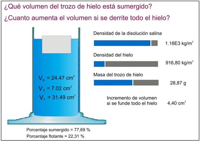 La otra animación (figura 4), remite a la estrategia de resolución del problema por vía experimental. Representa un trozo de hielo flotante en una probeta llena de una disolución salina, y se pueden usar tres controladores manuales para modificar la densidad de la disolución, la masa del pedazo de hielo y la propia densidad del hielo. Además de calcular los porcentajes y los volúmenes de hielo flotante y sumergido, la animación también obtiene el incremento volumen que se produciría en la probeta si se derritiera el pedazo de hielo.