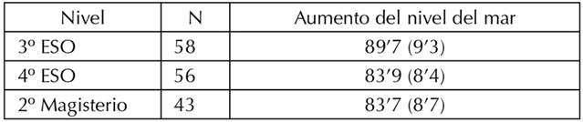 Como puede verse, en la cuestión se invita a citar más de una causa que explique dicha subida. Nuestra hipótesis, no obstante, fue que fruto de la ausencia efectiva de contenidos sobre cambio climático en las clases o de un tratamiento excesivamente superficial, apenas saldría ninguna referencia a la contribución de la dilatación del agua marina y que, en su mayor parte, las respuestas reflejarían la idea de la fusión del hielo en los polos, sin especificar que ese hielo, para contribuir sensiblemente y de forma directa al aumento del nivel del mar, debe ser hielo continental.