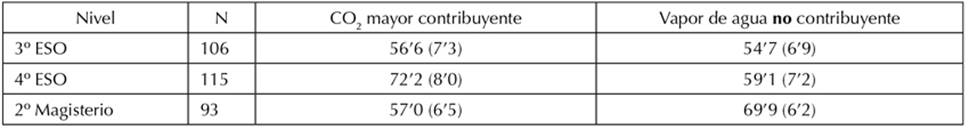 La segunda cuestión propuesta en ambos cuestionarios fue la misma (es por eso que el número de encuestados, N, es aproximadamente el doble en cada nivel educativo). En este caso, vale la pena resaltar que la respuesta científicamente correcta respecto al vapor de agua como el gas invernadero que más contribuye (globalmente) a este efecto y del nitrógeno como un gas inerte que no contribuye al efecto invernadero, es prácticamente inexistente en todos los niveles consultados. Por el contrario, el papel de gas que no contribuye al efecto invernadero, se asigna mayoritariamente al vapor de agua (seguridad entre 6 y 7) y el del gas que más contribuye a este efecto, al dióxido de carbono (seguridad entre 6 y 8).