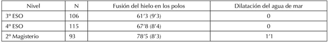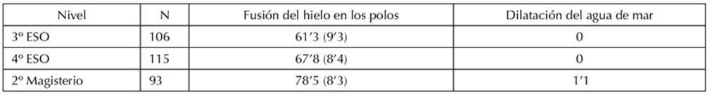 Lo que no aparece, es ninguna referencia explícita (excepto un caso aislado de 2º de Magisterio) al fenómeno físico de la dilatación térmica del agua marina.