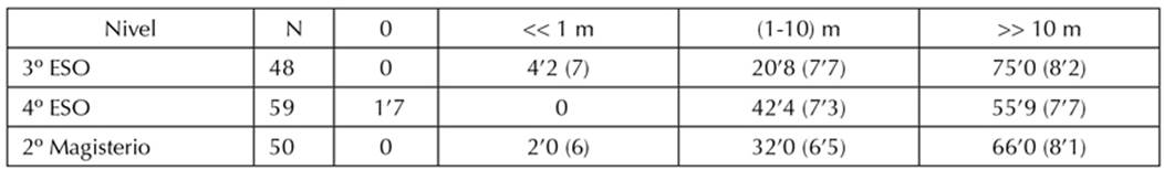 Los resultados anteriores se complementan con los correspondientes a la primera cuestión del cuestionario B (cuestión 1.B) formulada de una manera más cerrada. En este caso, se sabe que la respuesta correcta es que el nivel del mar subiría mucho menos de 1 m. Sin embargo, esta opción apenas es escogida y los encuestados se decantan mayoritariamente por la opción correspondiente a una subida mucho mayor de 10 m, con un grado de seguridad en torno a 8 en los tres niveles educativos. Es más, si se suma la opción (1-10) m con la opción “mucho más de 10 m”, los porcentajes superan en todos los casos el 90%. Las respuestas son, por tanto, coherentes con los resultados correspondientes a la cuestión 1.A.