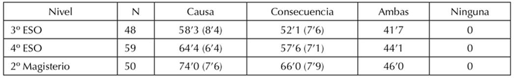 No obstante, si se compara los resultados de la cuestión 3.A con los de la tercera cuestión del otro cuestionario (cuestión 3.B), se evidencia que, al plantear de forma explícita la posibilidad de que el adelgazamiento experimentado en la capa de ozono pueda ser causa y/o efecto del cambio climático actual, los porcentajes cambian, de forma que en este caso, hay menos partidarios de que actúe como causa (aunque siguen siendo mayoría) y son muchos también quienes consideran que se trata de un efecto (porcentajes superiores al 50% en todos los niveles), con una seguridad que sigue siendo bastante alta en ambos casos (en general, entre 7 y 8). Tampoco es nada desdeñable el porcentaje de quienes consideran que puede jugar los dos papeles a la vez (causa y efecto), el cual se sitúa entre el 40% y el 46% en todos los casos.