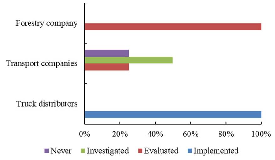 The results reaffirm this, as only the interviewees of the truck distribution business state that they have implemented projects associated with electromobility, a situation that only involves evaluating of this type of technologies in client companies’ operations, highlighting only one project that has already been authorized and is in the stage of importing electric equipment. This relegates forest transport companies in the regions of Ñuble and Biobío to an earlier stage of exploration and approach to electromobility (Figure 2), which, as mentioned before, is in agreement with the requirements that originated of their main client, but this has not yet evolved into any specific project that incorporates or considers this type of technology, which was mentioned by Iwan et al. (2019), who argued that, in countries such as Germany, Denmark, Poland, and Turkey, a non-dynamic market has emerged because most logistics operators do not know and/or have little experience in the field.