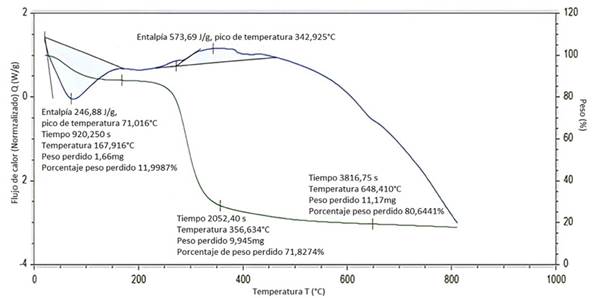El análisis térmico de la harina de yuca (Figura 1) muestra una endoterma centrada a 71°C, la cual refleja una pérdida de peso de alrededor de 12 %. Esto se debe a que la harina de yuca que ha sido deshidratada previamente adsorbe agua al volver a temperatura ambiente.
