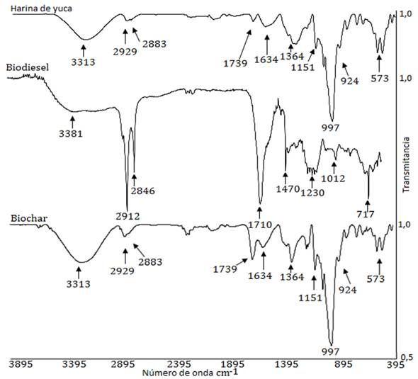 Los espectros de ATR-IR muestran que la harina de yuca y el biocarbón tienen una distribución de grupos funcionales similares entre sí (Figura 2). Una banda ancha de 3.310 a 3.330 cm-1 se atribuye al estiramiento OH por parte de compuestos fenólicos, alcoholes y agua adsorbida, comportamiento característico de los carbohidratos (Versino, López y García, 2015).