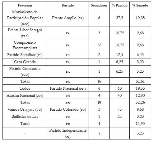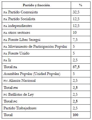 Dentro de los partidos, como muestra la tabla 1, el de gobierno, el Frente Amplio (FA), es el más fraccionalizado. Sin embargo, a su vez, es el que presenta una mayor disciplina partidaria (Buquet & Chasquetti, 2005). Además, puesto que desde su llegada al gobierno, en 2005, gobierna con mayorías propias en las dos cámaras del Parlamento, el diseño de las políticas en Uruguay depende en buena medida de las negociaciones en el interior de este partido.