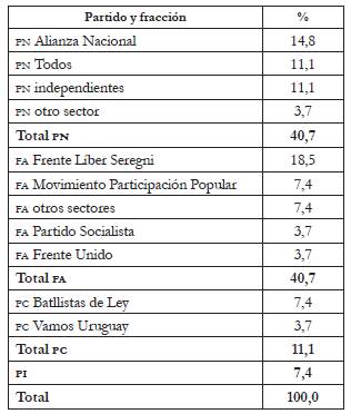 Los datos de la tabla 2 muestran que un 41 % de los líderes empresariales pertenece o vota al PN, un 41 % pertenece o vota al FA, un 11 % pertenece o vota al PC y un 7 % pertenece o vota al Partido Independiente (PI). En lo que se refiere a fracciones, el FLS del FA es la que capta mayores adhesiones, seguida por AN del PN. La sigue Todos, fracción mayoritaria del PN, junto con los nacionalistas que se declaran independientes o no sectorizados. En cuarto lugar se ubica el MPP del FA, otros sectores no especificados por la encuesta del FA y BL del PC. Por último, aparecen otros sectores del PN, el PS y el Frente Unido del FA -sector sin representación parlamentaria-, así como VU del PC.