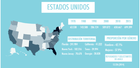Fuente: Elaboración propia basada en información del US Census Bureau' Chapter 2: Growth and Composition of the Immigrant Population (2013). La distribución territorial está basada en información del USCB FactFinder (2017). Las cifras de Refugiados y Solicitantes de Asilo fueron tomadas de la Base de Datos de ACNUR (2017).