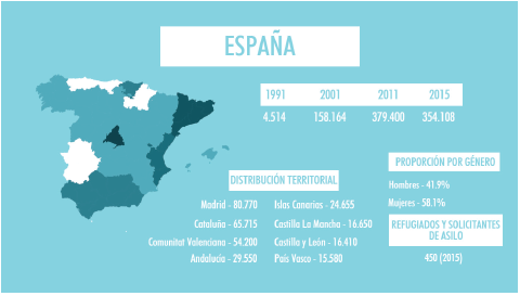Fuente: Elaboración propia basada en información tomada de la Base de Datos sobre Migración de la OCDE (2017) y del INE (1991; 2001 y 2011). La distribución territorial está basada en información del INE (2011). Las cifras de Refugiados y Solicitantes de Asilo fueron tomadas de la Base de Datos de ACNUR (2017).