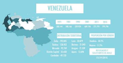Gráfico 3 Estado de la migración colombiana en Venezuela por dispersión territorial, proporción por género y población refugiada, 1971-2015