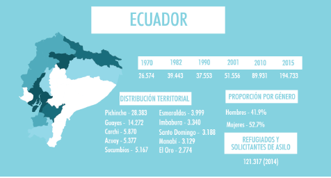 Aunque Ecuador no ha tenido una historia profunda como país receptor de inmigrantes, la representación porcentual de la población colombiana en comparación con las demás nacionalidades, al igual que en Venezuela, es mayoritaria a pesar de su tendencia a la baja. Por ejemplo, en 1950, alcanzó a representar un 62 % de la población extranjera en Ecuador, pasando por 52,3 %% en 1982, 51,3 %% en 1990, 49,5 %% en 2001 y 49,4 %% en 20104. Los colombianos en Ecuador están distribuidos, geográficamente, sobre todo en las provincias de Pichincha (28 383), Guayas (14 272), Carchi (5 870) y Azuay (5 377), además de una fuerte presencia en las provincias de zona fronteriza como Sucumbíos (5 167), Esmeraldas (3 999), e Imbabura (3 340); condición que comparte cierta similitud con el caso venezolano.