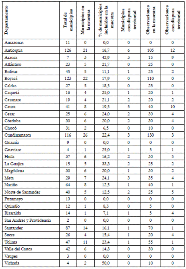 Un total de 68 observaciones por año/municipio se disputan territorialmente de acuerdo con al menos una especificación de disputa territorial. Estas observaciones se distribuyen entre 33 municipios en 19 departamentos. Esto significa que el 7,9 % de las observaciones y el 21 % de los municipios se disputan territorialmente al menos un año (Apéndice 2).