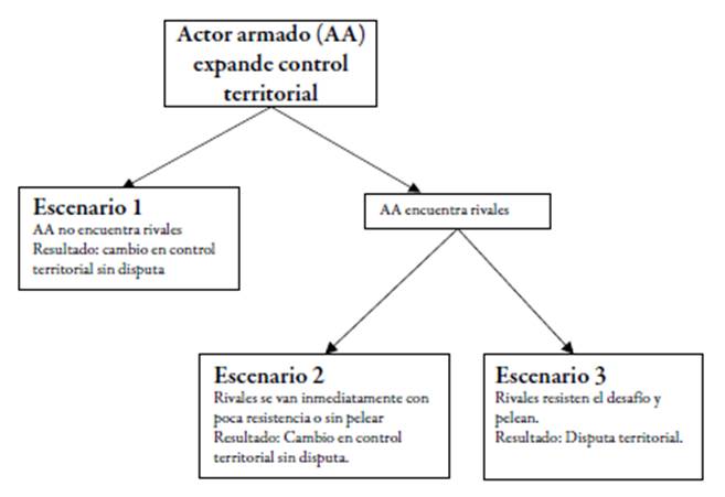 En el proceso de expandir su control territorial, los actores armados podrían (a) no encontrar rivales (escenario 1) o (b) encontrar rivales. Si se produce la última condición, el rival tiene dos opciones: puede huir y dejar la zona a los retadores (escenario 2), o puede participar en la lucha contra los retadores (escenario 3). En este artículo me centraré en el escenario 3 que llamo disputa territorial. Contestaré la siguiente pregunta: ¿Dónde es más probable que ocurra una disputa territorial? O, en otras palabras, ¿qué explica la distribución geográfica de la disputa territorial?