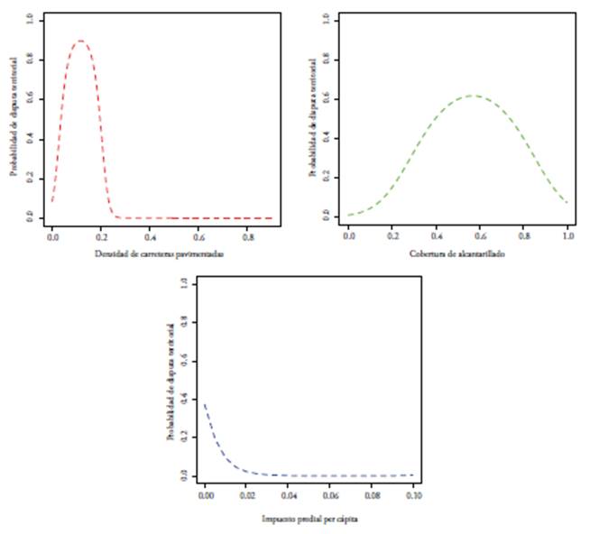 La figura 4 muestra las probabilidades pronosticadas de disputa territorial para diferentes valores de capacidad estatal. Como podemos observar, para los modelos de densidad de carreteras pavimentadas y de alcantarillado existe una relación en forma de U invertida entre la capacidad estatal y la disputa territorial. La disputa territorial es poco probable en la capacidad estatal baja o alta, pero mucho más probable en el medio. La disputa territorial es probable con una densidad de carreteras pavimentadas de 0,1 y 60 % de cobertura de alcantarillado. El modelo de impuesto predial per cápita muestra una excepción. En esta especificación, la capacidad del estado local se correlaciona negativamente con la disputa territorial. Es decir, a más impuesto, menos disputa.