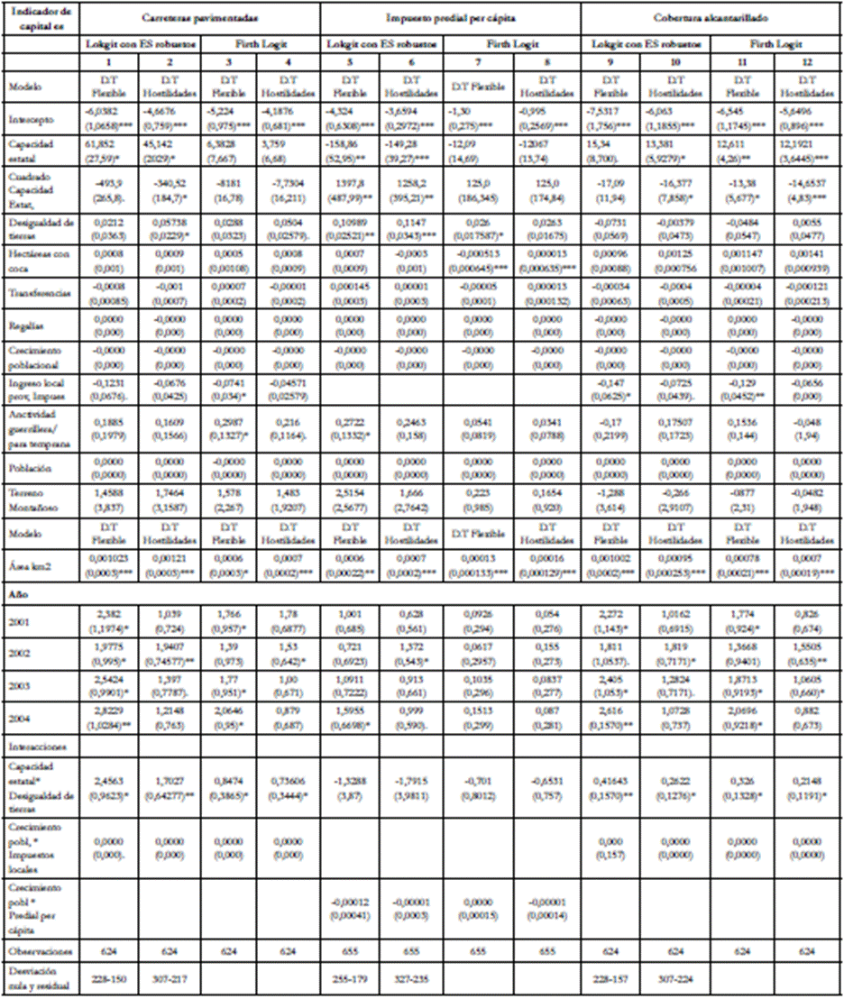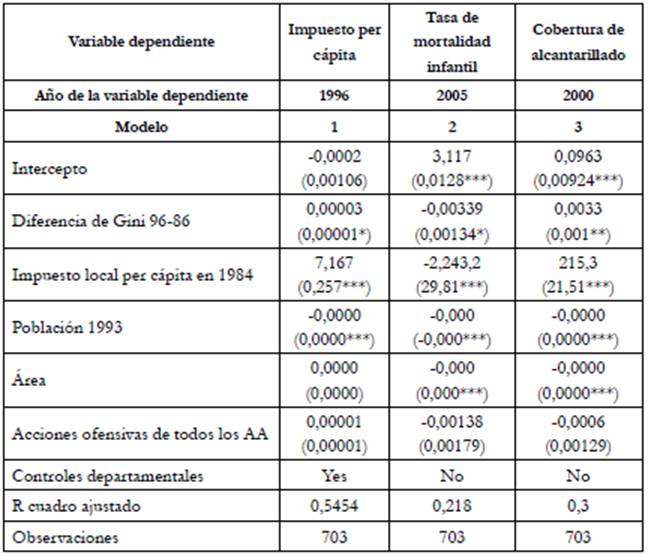 Según los resultados, existe una relación positiva y significativa entre una creciente desigualdad de la tierra y la capacidad estatal, incluso controlando la capacidad estatal anterior y la actividad del actor armado. Una mayor desigualdad en la distribución de la tierra se correlaciona con una mayor cobertura de alcantarillado, un mayor impuesto per cápita y una menor tasa de mortalidad infantil (signo negativo). Estas regresiones respaldan las hipótesis de los historiadores y sociólogos que han estudiado durante décadas el proceso de formación del estado colombiano (ver González, 2010; 2014; Pécaut, 2001).