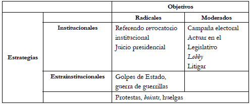 Con el fin de alcanzar estos objetivos, la oposición puede recurrir a estrategias institucionales o extrainstitucionales. Las primeras utilizan canales políticos convencionales como cortes, congreso o elecciones. Las segundas combaten al gobierno por fuera de estos canales, optando por repertorios de movilización como golpes de Estado, violencia, guerra de guerrillas, protestas, huelgas o boicots (tabla 1) (McAdam y Tarrow, 2000).