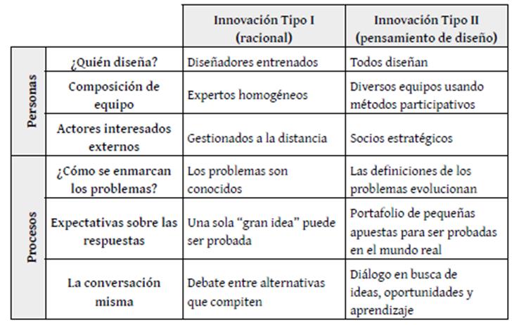 Como se advirtió al comienzo de este artículo, una de las principales promesas del pensamiento de diseño es que ofrece nuevas formas para innovar. Para ilustrar el punto, Liedtka et al. (2017) contrastan el paradigma de la "Innovación Tipo I", liderada por un pequeño grupo de expertos guiados por métodos racionales y la "Innovación Tipo II", que democratiza los procesos de innovación al involucrar a diferentes tipos actores y que emplea herramientas del pensamiento de diseño. La tabla 1 ilustra el contraste de estos dos tipos de paradigmas de innovación, a partir de sus diferencias en cuanto a quiénes son las personas involucradas en los procesos de diseño y cómo funciona cada uno de ellos.