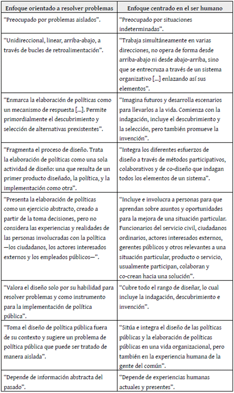 Precisamente para explicar por qué la aplicación del pensamiento de diseño en los procesos de políticas públicas puede representar un cambio de enfoque, es pertinente compararlo con otros paradigmas de diseño tradicionales. Junginger (2020), por ejemplo, resume el contraste entre los enfoques de diseño que están orientados a la solución de problemas con los enfoques centrados en las personas, como se ilustra en la tabla 2: