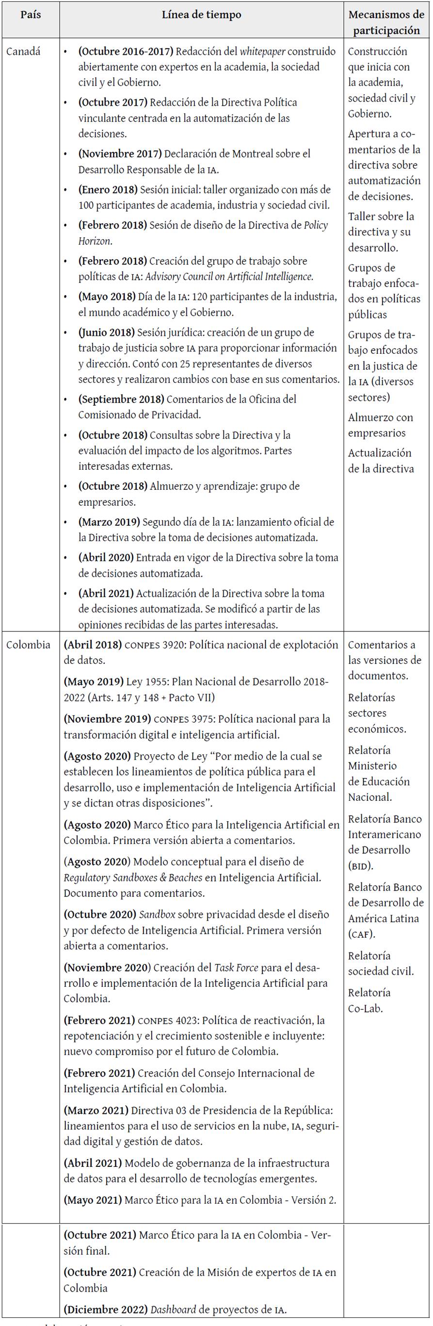 Para los efectos de este estudio, se describen en la tabla 1 las denominadas estrategias de IA con los diversos procesos participativos de Canadá y Colombia. Esta investigación centra sus esfuerzos en los procesos de Canadá y Colombia teniendo en cuenta que, de un lado, Canadá ya ha hecho una aproximación más allá de principios éticos y, de otro lado, Colombia es el país que ha puesto sus esfuerzos en promocionar los principios, pero sin miras a una regulación pronta. Además, la estrategia canadiense fue impulsada por un documento firmado por diversas partes interesadas, mientras que la colombiana, se basó en las aproximaciones de Estados Unidos y la Unión Europea, que se desarrollan más adelante. De esta forma, podremos contrastar dos estrategias diferentes en esencia, pero que comparten algunos puntos de contacto.
