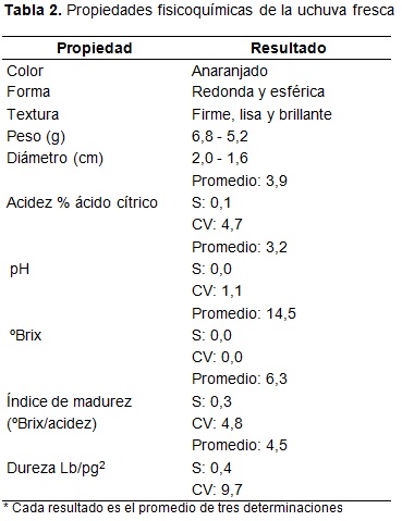 Las propiedades fisicoquímicas determinadas en la uchuva utilizada en el presente estudio se compararon con aquellas recomendadas por la norma técnica colombiana 4580 (13); en lo referente a parámetros como acidez, °Brix e índice de madurez se puede clasificar como un fruto grado 4 (fruto de color anaranjado claro) (tabla 2). También se contrastaron con lo reportado por Fischer (19) y se encontró que aunque parámetros como °Brix e índice de madurez coinciden, el pH y la acidez son ligeramente diferentes, posiblemente como consecuencia de condiciones distintas de cultivo. Sin embargo, estas características hacen de la uchuva una fruta apta para consumirla fresca o ser usada en diversas preparaciones, dado que por presentar un valor mayor de °Brix (5,14), comparado con frutos como lulo (20), es posible utilizar menor cantidad de azúcar en cualquier preparación. El pH es adecuado para evitar crecimiento de microorganismos y la acidez proporciona una sensación agradable al paladar. En cuanto al contenido de vitamina C la uchuva presenta un valor mayor a frutos como fresas y uvas.