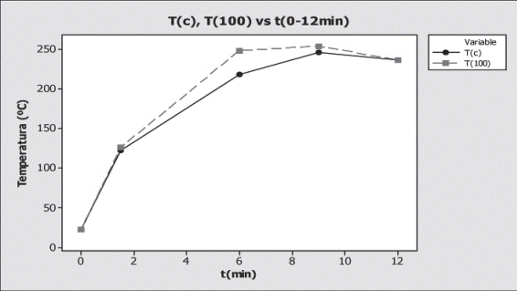Figura 1 Comportamiento de la temperatura según tiempo de exposición, de las muestras de aceite de girasol (Tc) y adicionada con Bixa orellana (T100) durante el calentamiento en horno microondas.