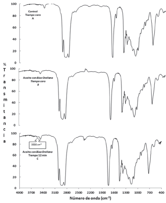 En el espectro del aceite con Bixa orellana 100 ppm después de 12 min de calentamiento (Figura 2C) aparece una pequeña banda -1 en aproximadamente 3.530 cm , la cual se puede atribuir a alcoholes como productos secundarios de oxidación, a causa del tiempo y la temperatura de cocción en el microondas, lo que coincide con los resultados obtenidos para el índice de peróxido.