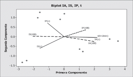 Figura 3 Representación biplot de PCA del control y muestra adicionada con Bixa orellana100 ppm, de la evaluaciónde índice de saponificación (IS), índice de peróxidos (IP) e índice de acidez (IA) durante el calentamiento enmicroondas En la figura se ilustran los resultados de los análisis PCA para el control (línea continua) y para la muestra (línea discontinua).
