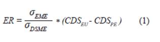 Un cuestionamiento que puede surgir al uso del EMBI radica en que la diferencia de los márgenes de los bonos del país emergente, no son suficientes para medir la exposición al riesgo de inversión en un mercado emergente. El inversionista debería esperar que el rendimiento en un mercado emergente sea mayor que el margen impuesto a la deuda soberana de dicho país, de tal forma que el riesgo país (CR) sería mejor determinado a traves del Equity Risk (ER) (Damodaran, 2015).8Así, para saber qué tan alto debe ser este premio por riesgo país, se usa la volatilidad relativa del mercado accionario del país emergente9 (oEME) con la volatilidad de los rendimientos de los bonos soberanos10 (oDSME) y se multiplica por el margen (spread) entre los Credit Default Swaps de la deuda de Estados Unidos (CDSEU) y los Credit Default Swaps de la deuda del país emergente (CDSPE):