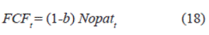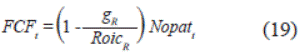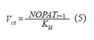 El objetivo principal de este trabajo es definir la estructura de capital y no valorar la empresa, aunque para definirla es necesario determinar el impacto de la misma en el valor de la compañía. En este caso, se supone que en los mercados maduros la utilidad económica y la tasa de crecimiento real (g) tienden a cero.16 La inversión bruta sería financiada con la generación interna de fondos, de tal forma que el capex neto sería cero y por consiguiente el valor de la empresa sin deuda en el periodo t (VUt) se obtiene de dividir la utilidad operacional, después de impuestos del período siguiente (NOPATt+1)17 sobre la tasa de costo de capital de la empresa sin deuda (Ku).