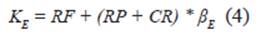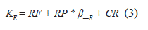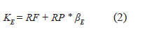 Para hallar el costo de capital propio se usa el modelo CAPM (Sharpe, 1964; Lintner, 1965; Mosin, 1966). El costo del capital propio (KE) es igual a la suma de la tasa libre de riesgo (RF) más la prima por riesgo (RP), multiplicado por el beta del capital propio (BE):