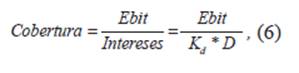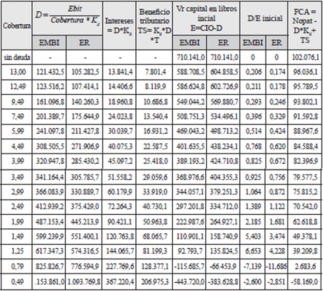 En la tabla 5, el valor de la empresa apalancada (Vo) para los diversos niveles de cobertura sa obtiene de sumar el valor del capital propio a precios de mercado (VE) más el valor de la deuda (Vo= VE+D= E+D). El cálculo se hizo utilizando ambos indicadores de riesgo país (EMBI y ER); nótese que el mayor valor de la empresa coincide para el mismo nivel de cobertura, entre 4 y 4,49 veces.