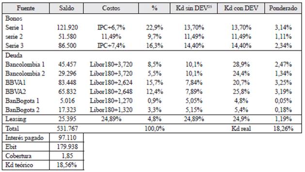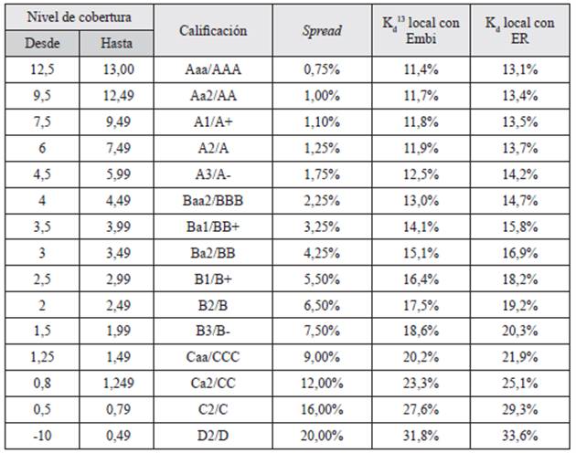 Teniendo el CR, se puede calcular el valor del costo de la deuda (Kd) para cada nivel de cobertura de la utilidad operativa (Ebit) sobre los intereses; al resultado se le debe aplicar la identidad de Fisher para ubicar la tasa en términos equivalentes para Colombia.12 Los resultados se pueden ver en la tabla 2: