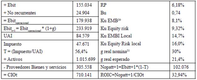 En la tabla 3 se pueden ver los cálculos referidos anteriormente; también se muestra el Capital invertido operativo (CIO) calculado como los activos de operación menos los proveedores de bienes y servicios y el Ebit sin gastos no recurrentes. Estos cálculos están basados en los estados financieros de la empresa.