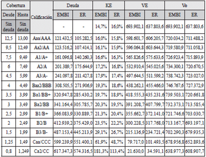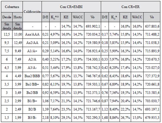 En la tabla 6 se puede observar que el Vo calculado con el Nopatt+1 y el Wacc da el mismo valor que el calculado antes, sumando la deuda más el capital propio a precios de mercado. Además, se denota que la estructura de capital óptima (D/E) minimiza el Wacc y, a su vez, maximiza el valor de la empresa, sin importar la medida de CR usada. Sin embargo, dado que la prima por riesgo país es mayor por el ER, la relación D/E óptima es más baja usando este método. Algunos valores del extremo inferior fueron suprimidos por parsimonia y el costo de la deuda está expresado después de impuestos (Kd*).